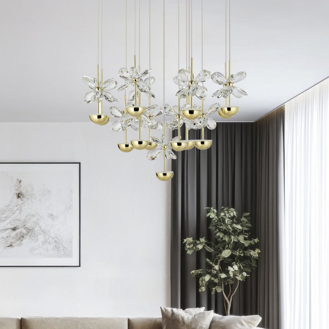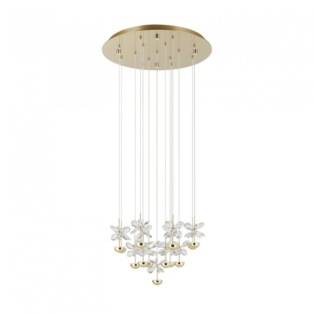 - DESCRIPCIÓN: Colgante de 12 luces LED 34w con base redonda hecha de metal negro con una variedad de elementos de color dorado que inspirado en hojas.