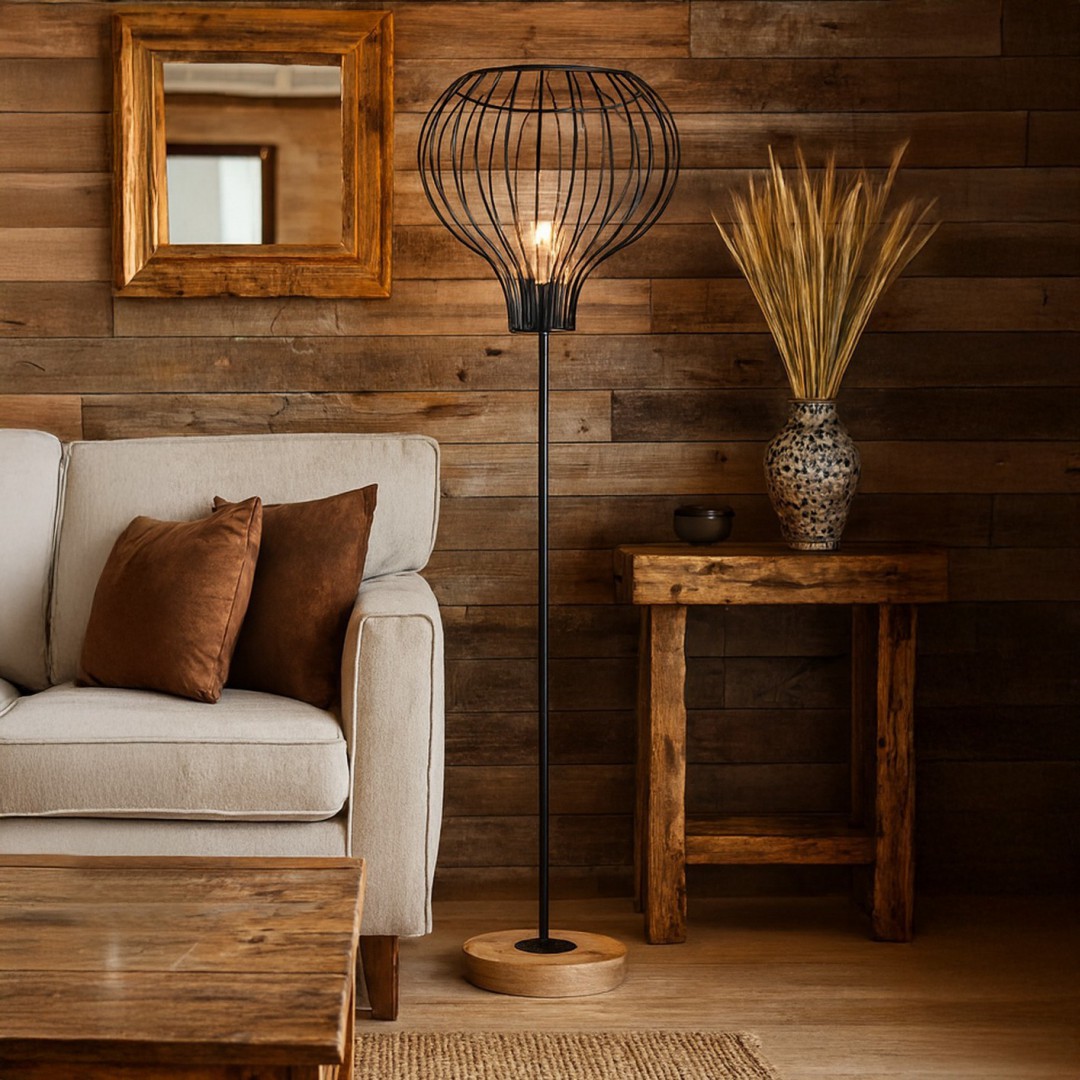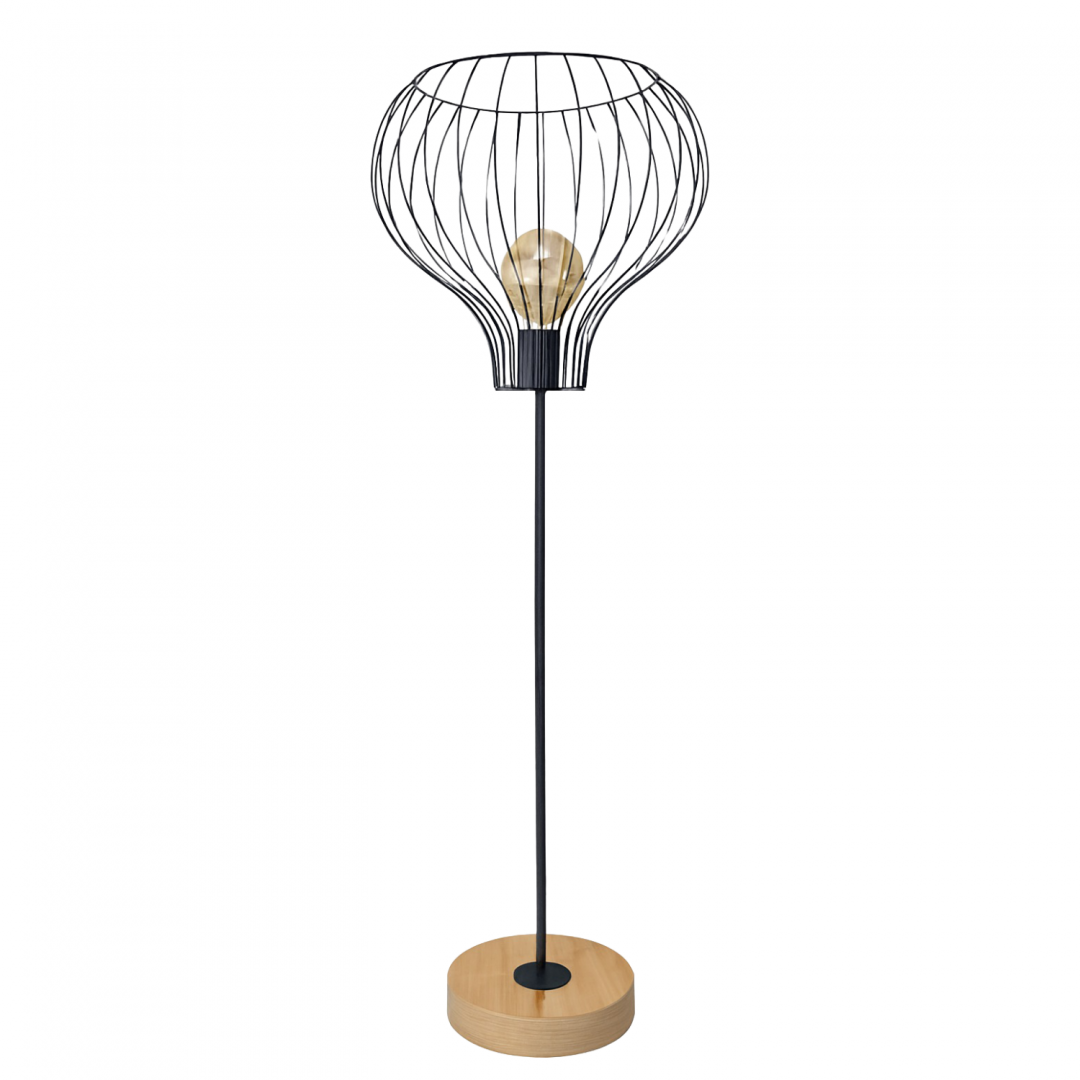 • DESCRIPCIÓN: Lámpara de pie en madera paraíso con jaula decorativa en metal negro o blanco