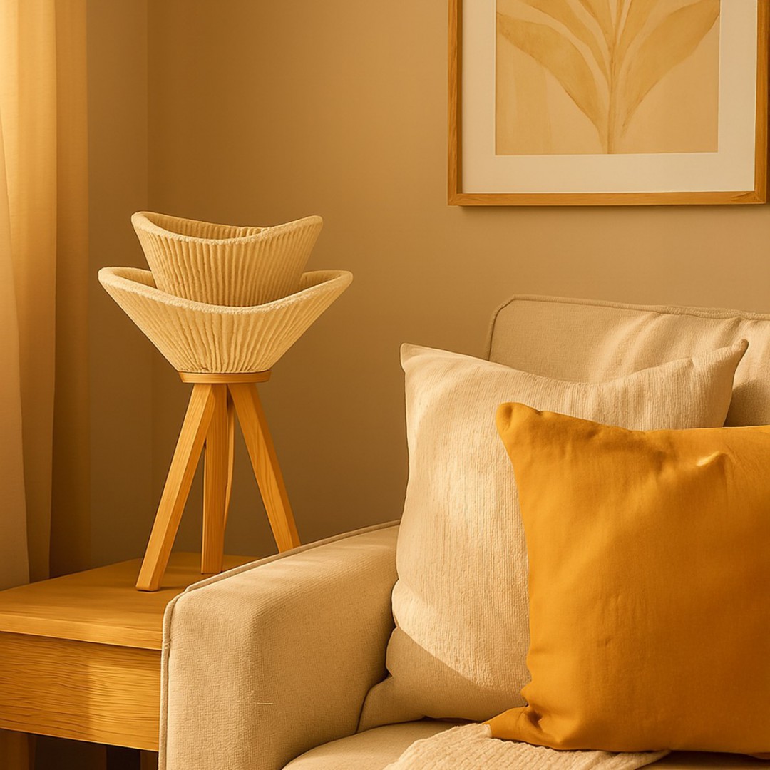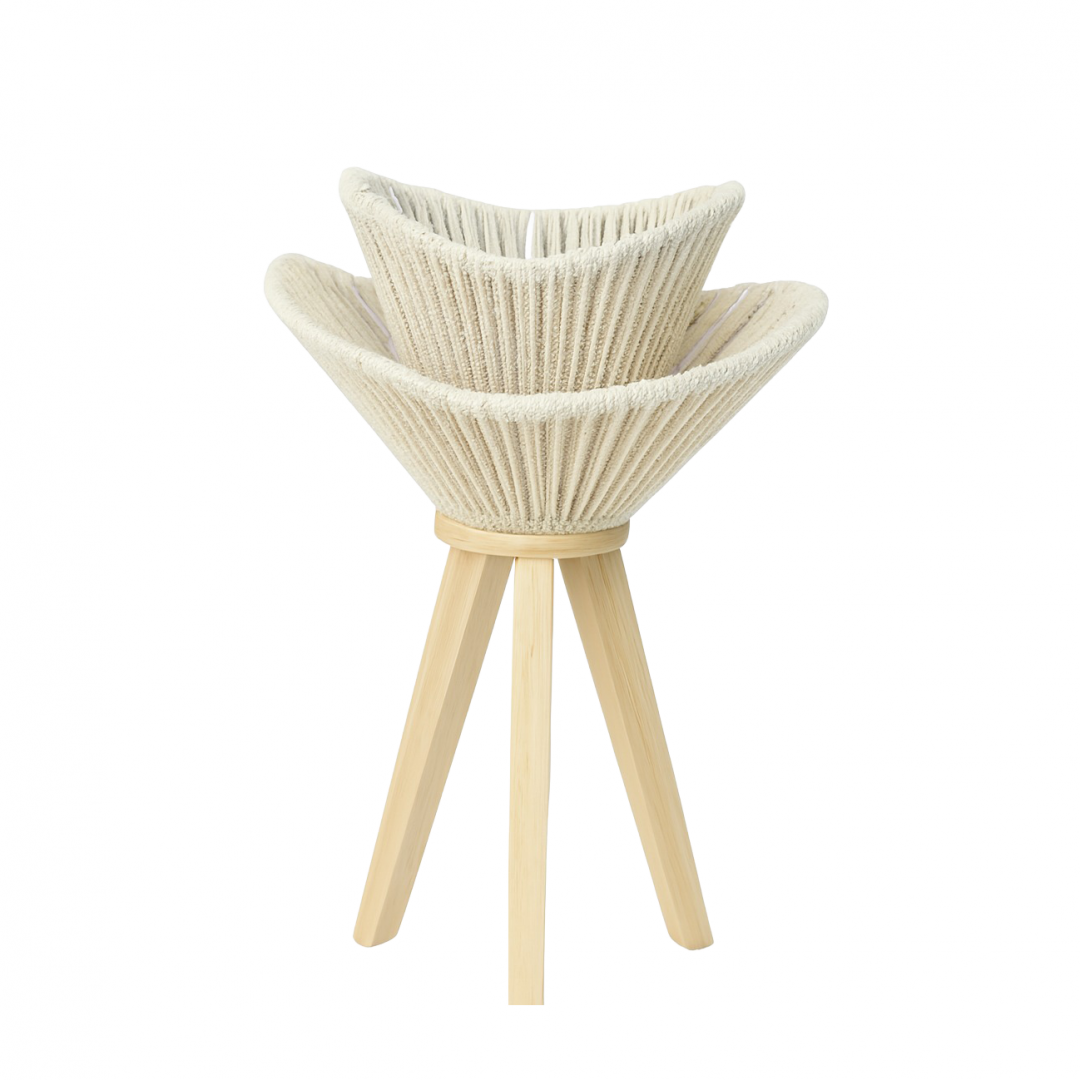 - DESCRIPCIÓN: Velador en madera paraíso con pantalla en forma de rosa tejida en hilo de polipropileno en color blanco o tostado
