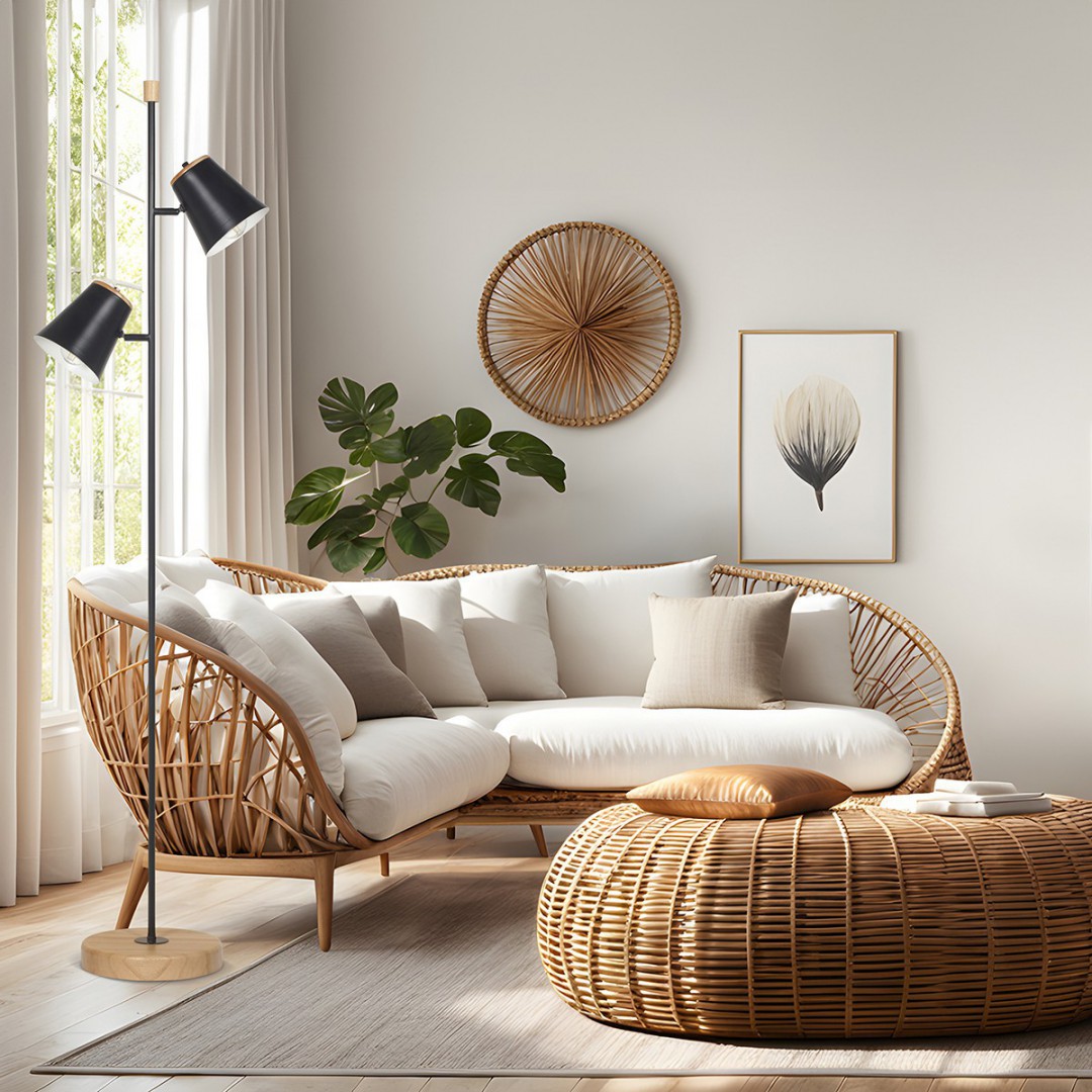 • DESCRIPCIÓN: Lámpara de pie de dos luces en madera paraíso con campanas de metal y detalles en color blanco o negro