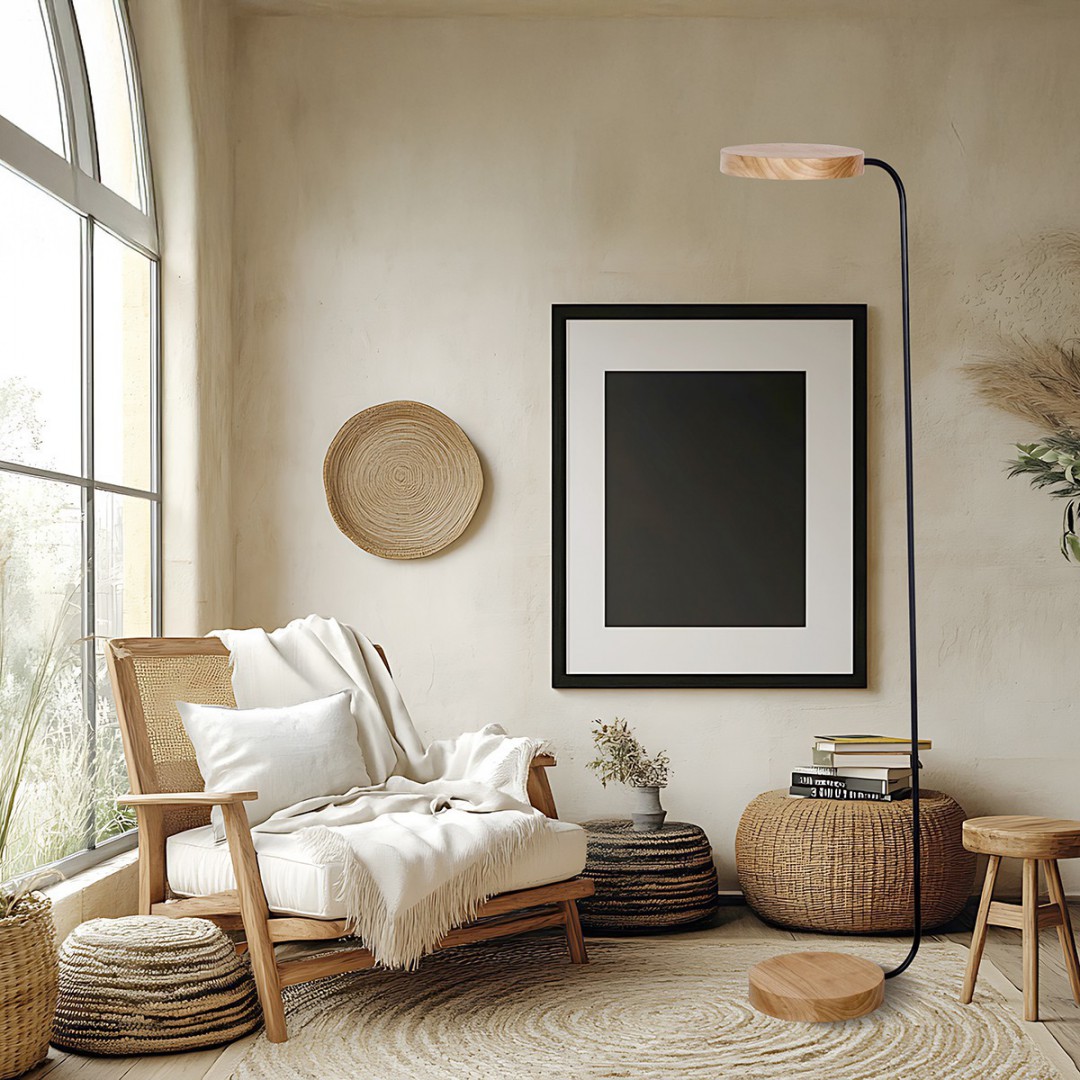 • DESCRIPCIÓN: Lámpara de pie en madera paraíso con metal negro