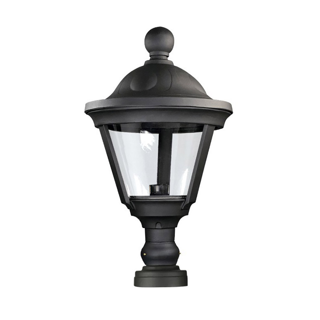 - DESCRIPCIÓN: Cabezal farol cónico estilo francés para pilar mampostería con base Ø130 mm. Sistema óptico de acrílico transparente cónico.