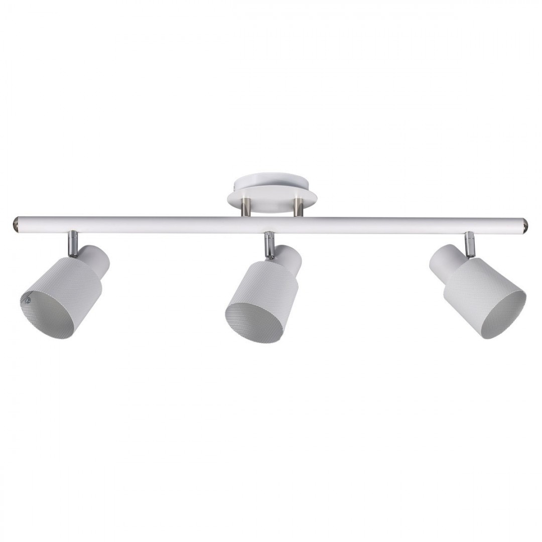 - DESCRIPCIÓN: Aplique de techo, sistema múltiple, de tres luces. Terminación Cromo o Blanco Microtexturado. Pantallas metálicas disponibles en color Rojo Blanco,Plata o Negro.
