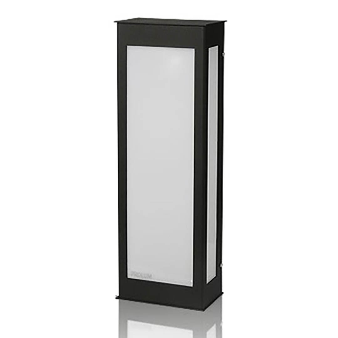 Compuesta por cuerpo y base de fijación a pared en chapa de aluminio. Todos sus componentes son sometidos a proceso de tratamiento de superficie y posterior acabado con pintura polyester termoconvertible, microtexturada, con filtro UV (apto para exterior), horneado a 180-200ºC.
