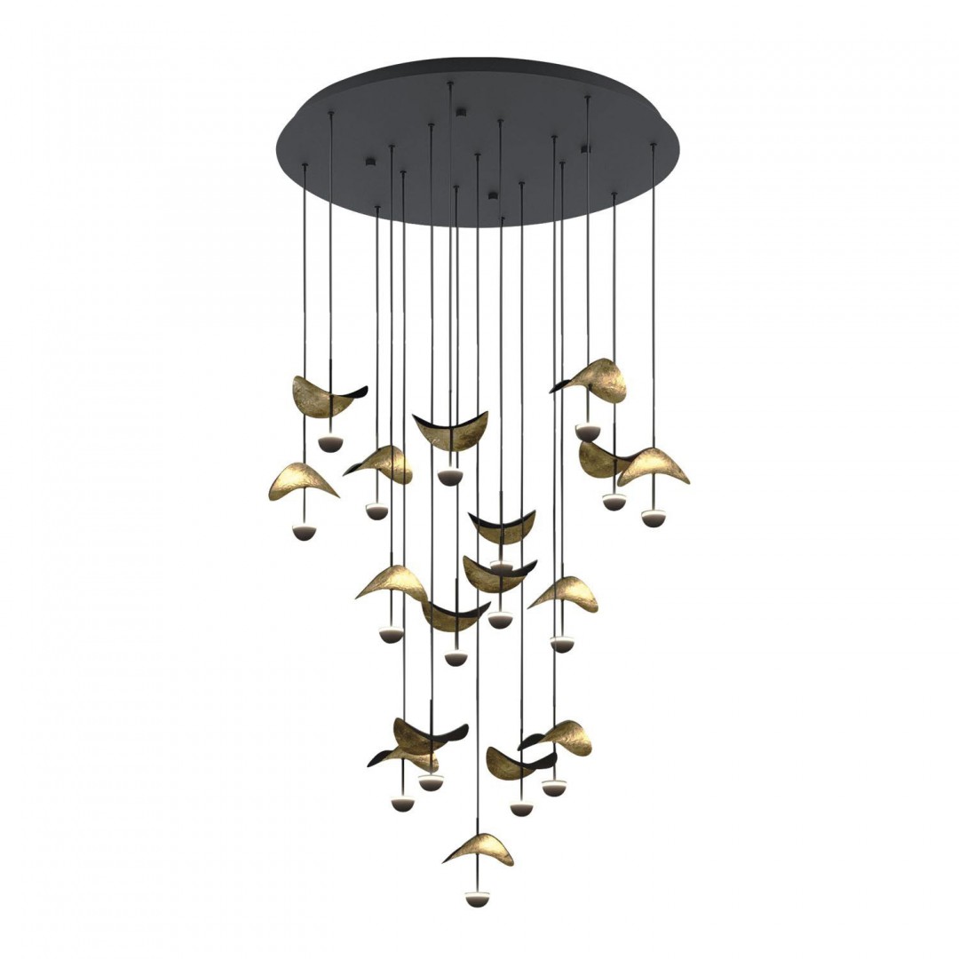 - DESCRIPCIÓN: Colgante de 17 luces LED 48 W con base redonda hecha de metal negro con una variedad de elementos de color dorado que inspirado en hojas.